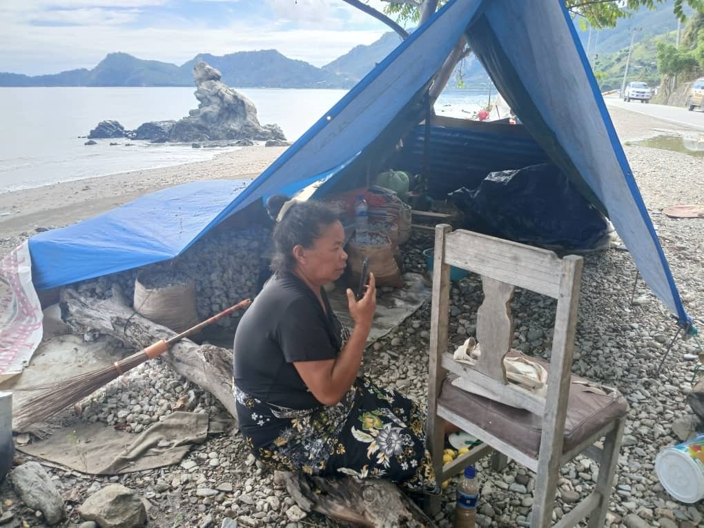 Abitante afetadu despeju administrativu, Amélia dos Santos, hamutuk ho ninia membru família kontinua hela iha lona okos iha tasi-ibun Bidau Santa-Ana, kuarta (08/05/2024). Imajen Tatoli/Arminda Fonseca
